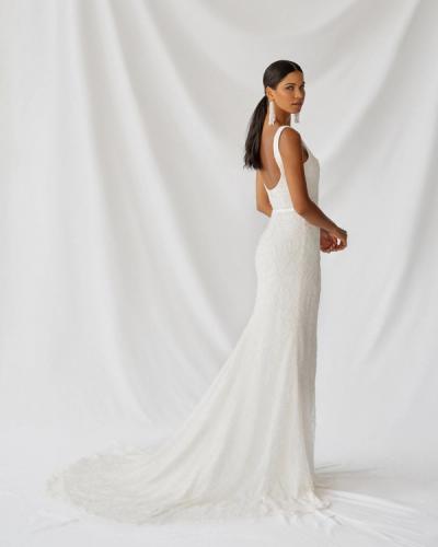 Aspen is a fully beaded gown with a structured bodice with soft square neckline.