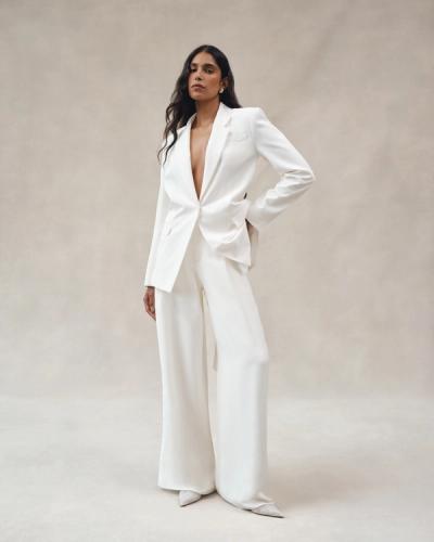 The Frances Suit features an oversized jacket and wide leg pants made in matte silk crepe. The jacket comes with a tie closure and can be worn with a defined waist or relaxed feminine fit.