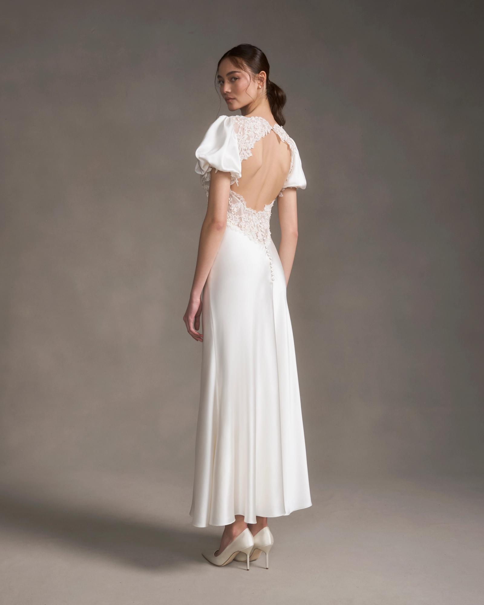 Prince is a fancy tea-length dress cut on the bias for an especially flattering drape. Constructed in our signature crepe back satin with french corded lace details and satin ribbon detailing along the waist and scalloped keyhole opening at the back.