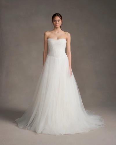 An ethereal drop-waist gown with pleated layers of tulle overtop a structured corset bodice, featuring a touch of corded lace at the high hip.